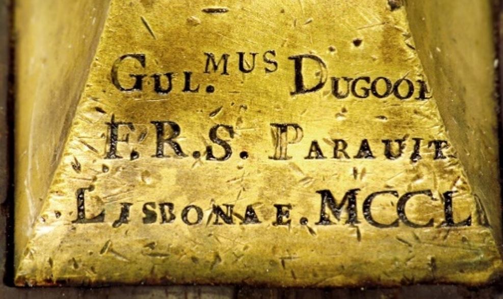 Na base da coluna de latão pode ler-se Gul.mus Dugood, F.R.S. Parauit, Lisbonae. MCCLI. Pensamos que há um erro na data. Deveria ser 1751 (MDCCLI) e não 1251. Este magnete foi construído por William Dugood, ourives inglês responsável também pela construção do Magnete Chinês deste Gabinete.