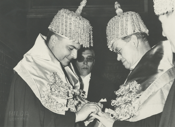 As insígnias doutorais da Universidade de Coimbra são constituídas pela borla, capelo e anel da cor correspondente à Faculdade que confere o grau. No caso presente, o azul celeste da borla identifica a Faculdade de Ciências, que conferiu a Arthur Exell o grau de Doutor honoris causa a 4 de Novembro de 1962.