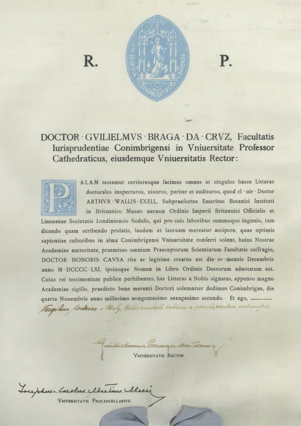 Arthur Wallis Exell (21.05.1901-15.01.1993), botânico inglês formado por Cambridge (1926), que durante perto de três décadas exerceu funções no Museu Britânico. Participou em três expedições científicas realizadas em África, de que resultou a publicação de obras ainda hoje consideradas de referência para o estudo da flora daquele continente. A primeira viagem, organizada em 1932-33, teve como destino as ilhas do Golfo da Guiné (São Tomé e Príncipe, Fernando Pó e Ano Bom); em 1937, visitou Angola, integrado na missão chefiada por Luís Carriço (UC); e em 1951, acompanhou Francisco de Mendonça (UC) e Hiram Wild na expedição à Rodésia, Niassalândia e Moçambique, aonde regressaria em 1955.