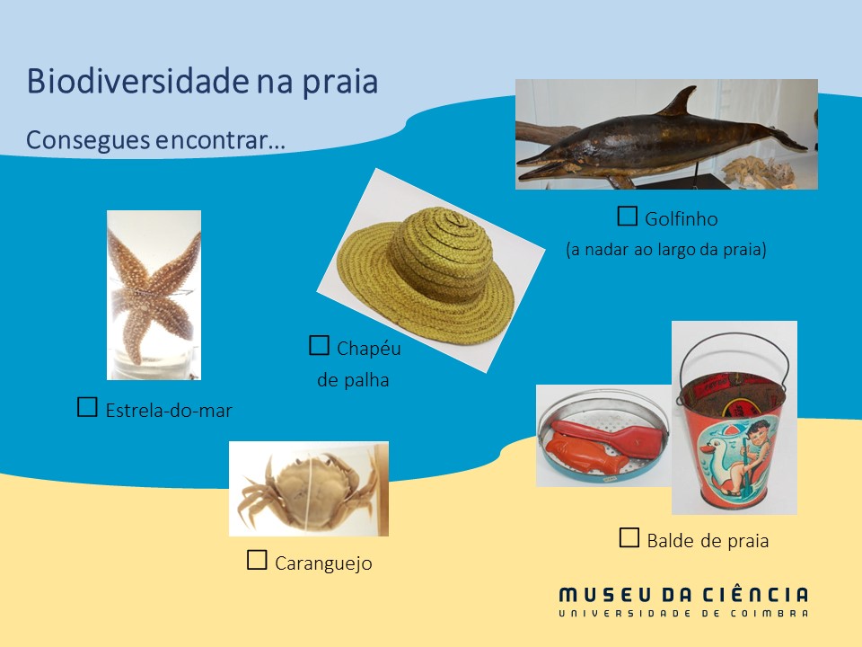 Uma estrela-do-mar, um golfinho a nadar, um caranguejo… e um chapéu de palha e um balde.