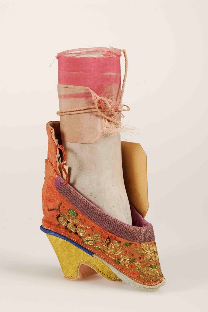 Deste conjunto faz parte este exemplar que hoje apresentamos, um sapato de lótus. Com a ajuda de uma faixa, procedia-se à compressão do pé que forçava os ossos dos tarsos, metatarsos e falanges dos pés para a região plantar, provocando deformações ósseas irreversíveis. Desde os primeiros anos de vida, as mulheres que pretendessem ascender socialmente eram submetidas a esta prática, que impedia o normal crescimento dos pés, sendo que, na fase adulta, não deveriam ultrapassar os 8 cm de comprimento.