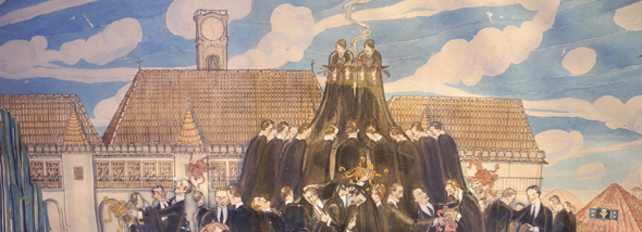 Esta ilustração dirige-nos para um ambiente de festa onde a capa e a batina, as pastas e as fitas são marcantes, e embora a participação masculina impere – como era próprio do tempo histórico – a ambiência é claramente convidativa à celebração, à alegria e à confraternização geral.