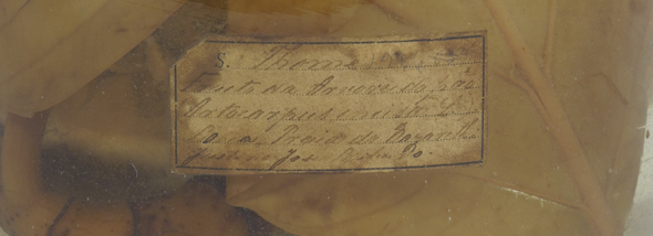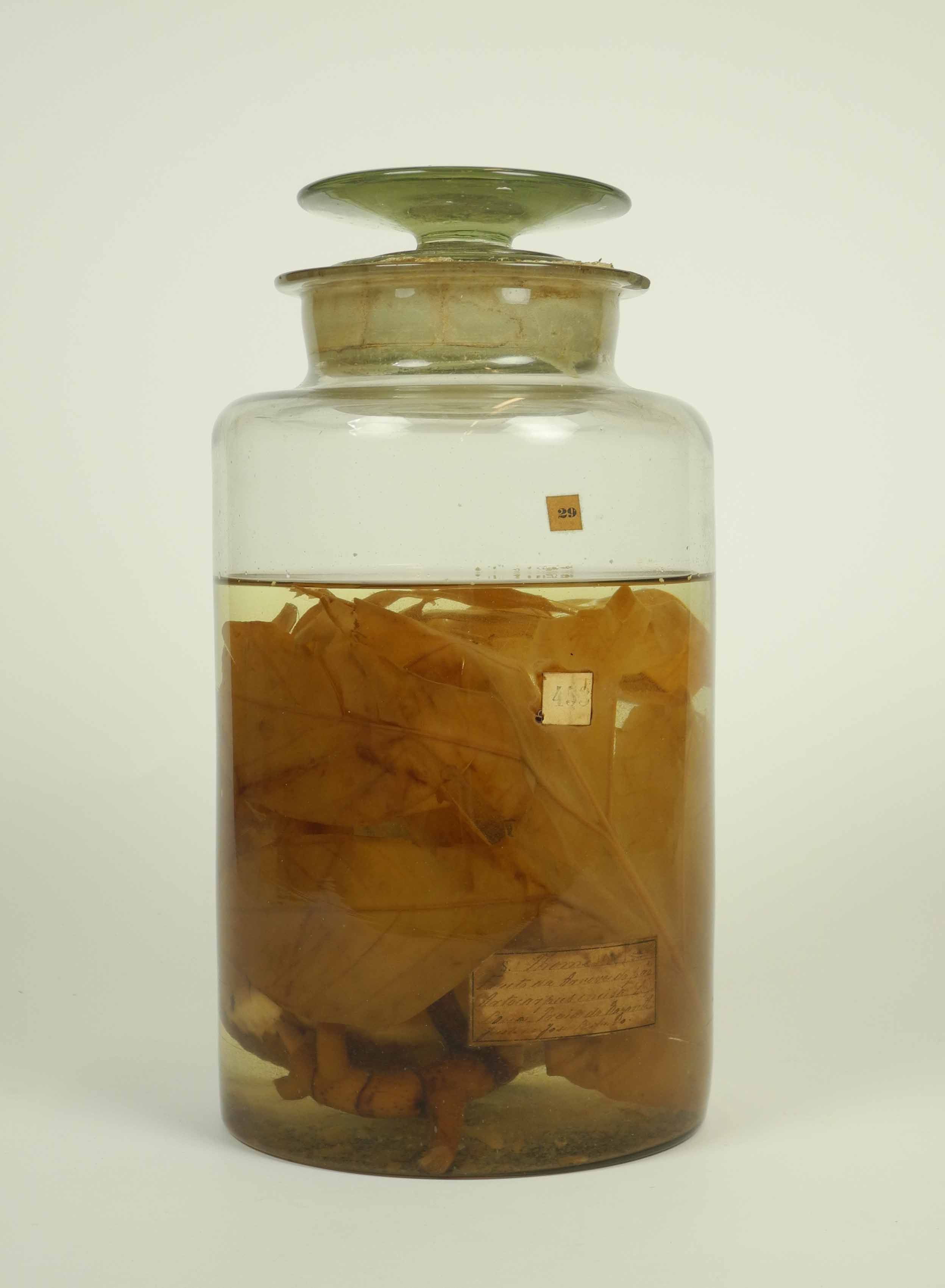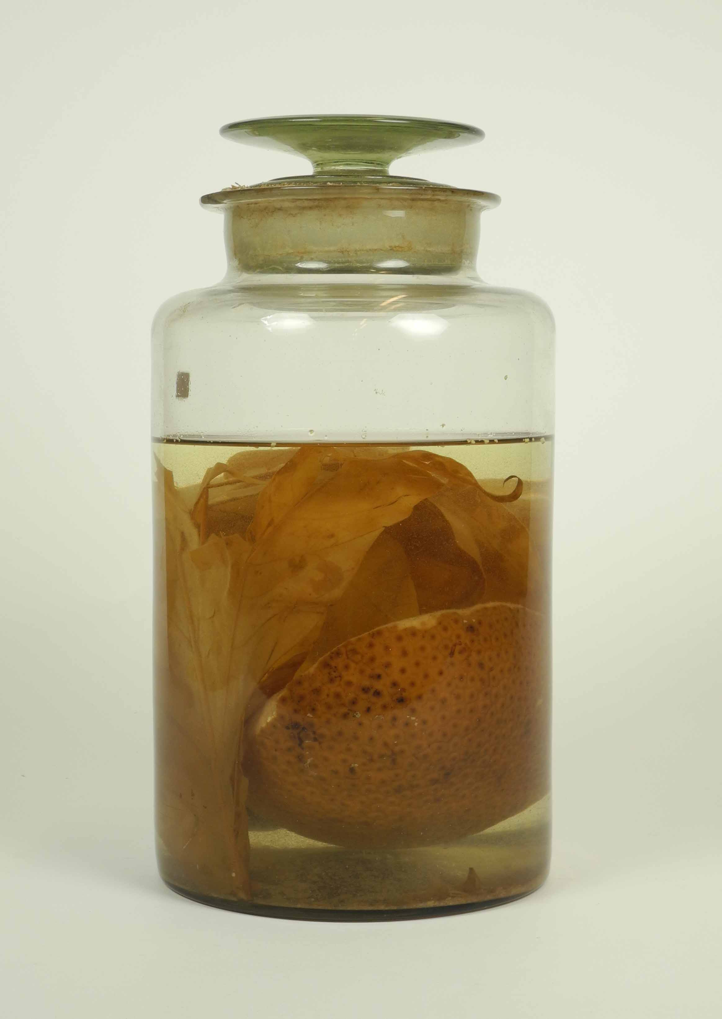 Um frasco de vidro cilíndrico com rolha esmerilada contém, em meio líquido, o fruto e folhas de fruta-pão, também conhecida por jaca. O nome científico Artocarpus incisus (Thunb.) L. f. foi o primeiro nome, publicado em 1782, e é sinónimo de Artocarpus altilis (Parkinson) Fosberg, nome atualizado e publicado em 1941.