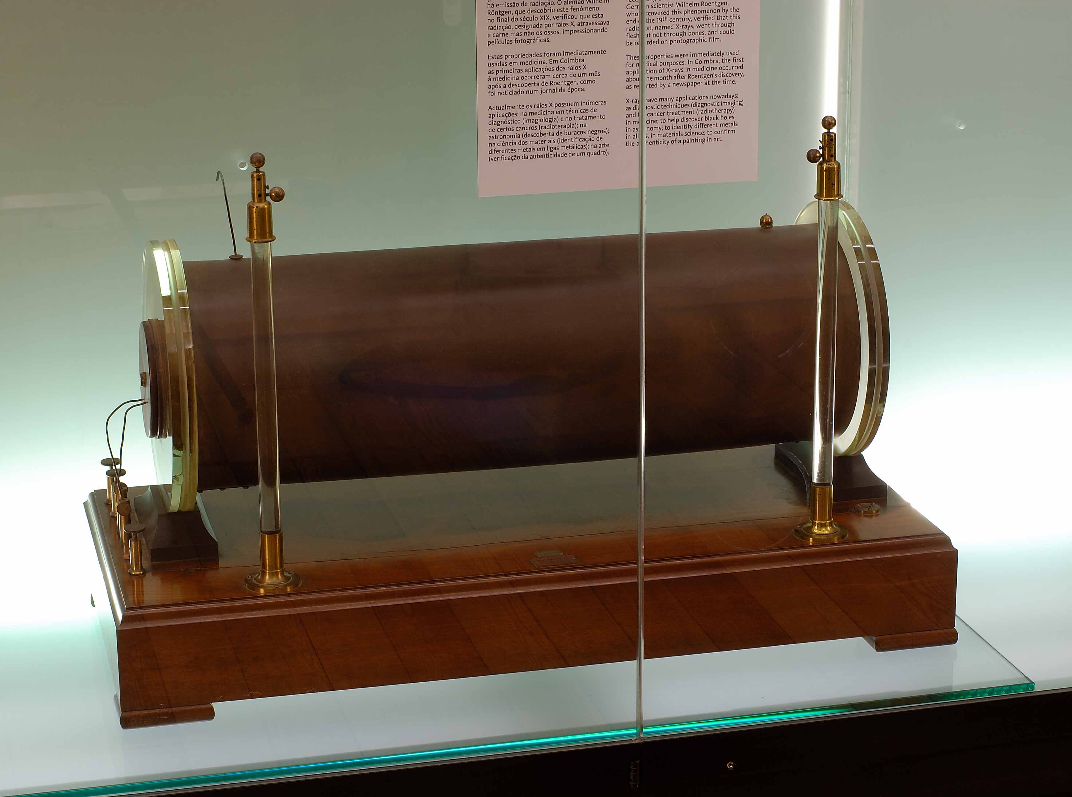 Foi com esta bobine que Henrique Teixeira de Bastos fez em 1896 as primeiras radiografias em Portugal, cerca de um mês após o anúncio da descoberta de Röntgen. Segundo um texto de Teixeira de Bastos, “Nas experiências realizadas no gabinete de physica da Universidade, uma grande bobina de Ruhmkorff era excitada por seis elementos Bunsen, e a descarga era recebida num tubo de Crookes. A uns dez centímetros do tubo, envolvida em papel preto, colocava-se a placa fotográfica (Schleussner), normalmente aos raios catódicos. Sobre a placa assentava o objecto da experiência. Obtiveram-se bons resultados, com exposições não inferiores a vinte minutos, nas radiografias de uma chave e de um dedo cortado do cadáver (o primeiro ensaio feito), de uma mão viva, de uma caixa de pesos, de uma sardinha.”
