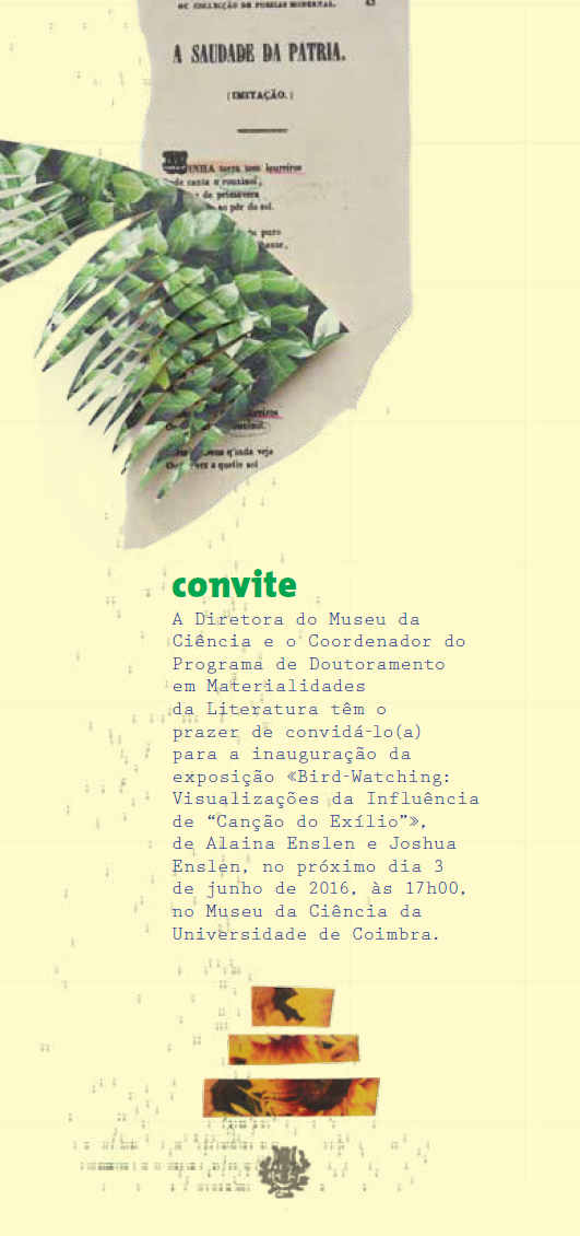 Escrito em Coimbra em 1843 pelo estudante brasileiro António Gonçalves Dias, “Canção do Exílio” é um dos poemas mais populares de todos os tempos. Durante os últimos 173 anos, o texto de cunho romântico-nacionalista tem inspirado milhares de adaptações por escritores de vários países em todas as épocas e géneros literários, especialmente no Brasil, onde a sua reinvenção textual continua hoje em blogues e sites como Twitter, Facebook e Instagram. Ao aplicar teorias e métodos da crítica literária, da historiografia, das artes visuais e da ciência das redes, esta exposição colaborativa, baseada em mais de mil textos, músicas e fotografias recolhidos ao longo de três anos, apresenta várias leituras visuais da imensa e diversa influência do poema.