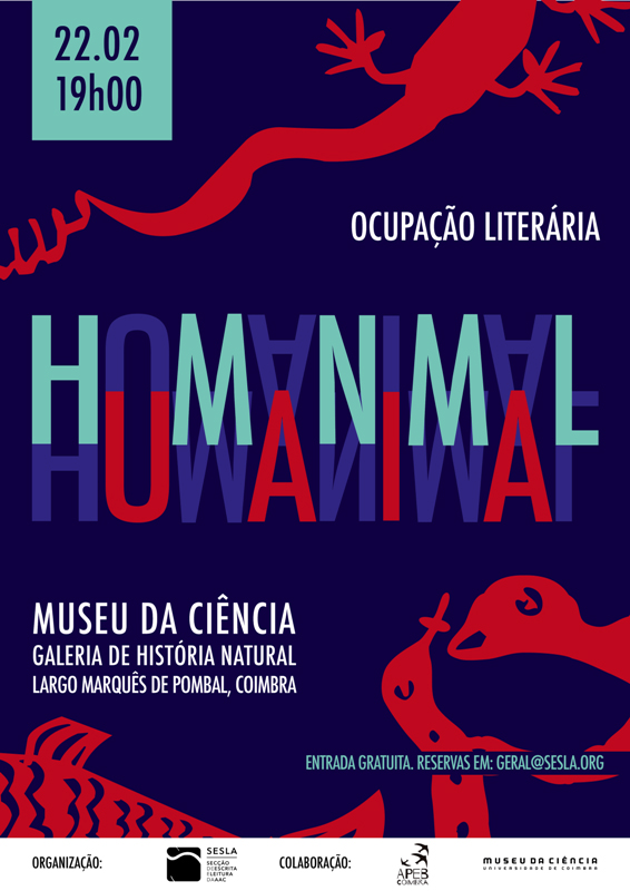 A Ocupação Literária «Humanimal» é fruto de uma parceria entre a Secção de Escrita e Leitura da Associação Académica de Coimbra (SESLA) e o Museu da Ciência da Universidade de Coimbra. Dialogando com o percurso expositivo da Galeria de História Natural, a SESLA irá estimular os sentidos do espectador para as confluências do espaço e da poesia, através de uma ação artístico-literária. O evento contará ainda com uma video-performance acompanhada por uma leitura de palco. «Humanimal» é uma proposta de interrogação sobre a animalização/desumanização ou uma hierarquização das relações entre as pessoas e os animais.